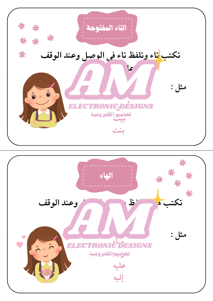مطوية التاء المربوطة والتاء المفتوحة والهاء لغتي، عبارة عن صفحتين تنطبع في ورقتين A4 ثم تقص من المنتصف وتتدبس الاوراق، يتم تسليم الملف فورًا بعد الشراء.