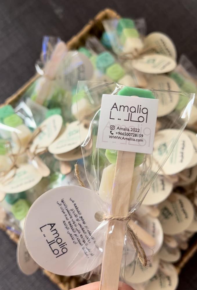 ثلاث قطع من الشموع الفواحه على حروف KSA برائحة الفانيليا و الياسمين و الخزامى بدرجات اللون الأخضر ملصقه على أعواد خشبية