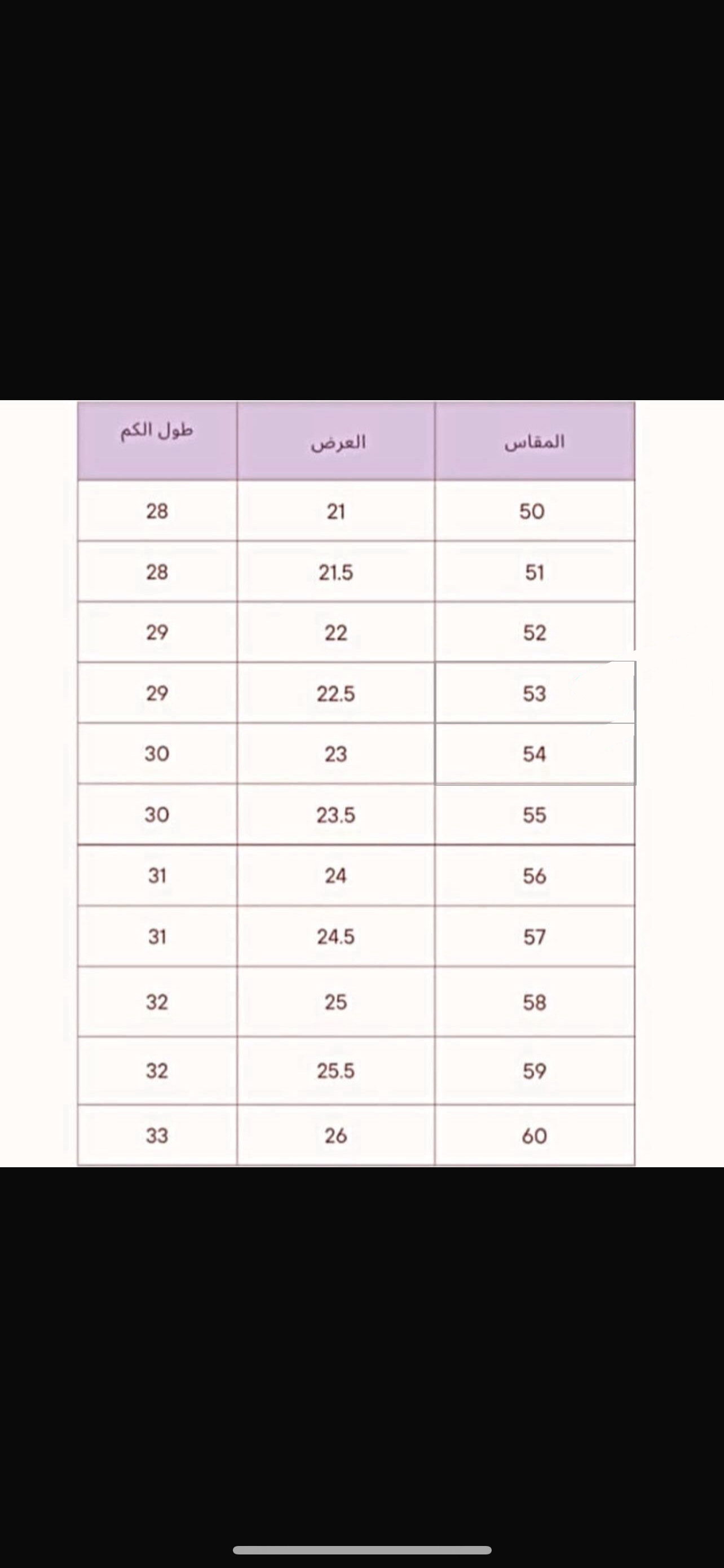 جدول المقاسات