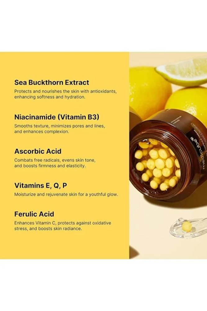 - يحتوي فيتامين سي لتعزيز نضارة الجلد وتحسين مرونة البشرة بسرعة