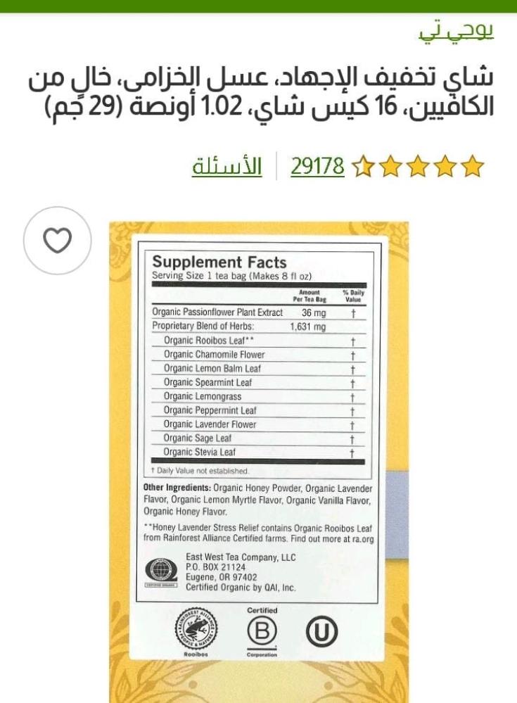 شاي تخفيف الإجهاد والعسل الخزامي عضوي