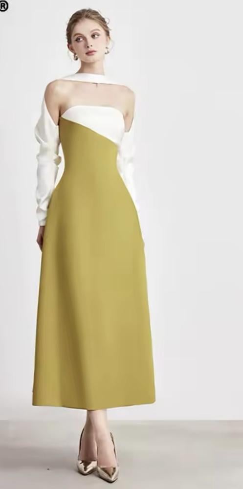 فستان بطول متوسط من اللون الاخضر الليموني مع أكمام بيضاء من قماش فاخر يليق بمناسباتكم السعيدة والمميزة