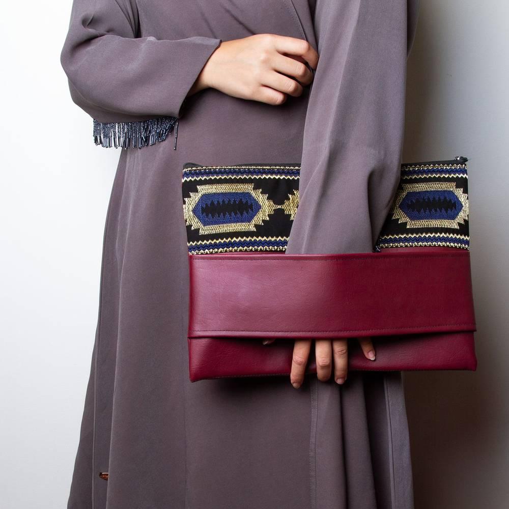 •الخامة: جلد نباتي فاخر مع قماش مطرّز بتصميم فني أنيق مستوحى من النقوش تراثية.