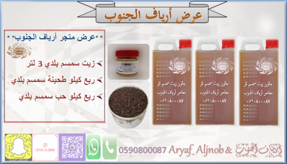 * * عرض متجر أرياف الجنوب * * 3 لتر زيت سمسم عضوي بلدي . . .ربع كيلو طحينة سمسم بلدي . . .ربع كيلو حب سمسم بلدي عضوي . . .