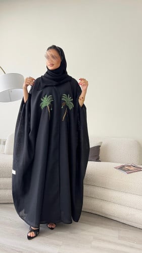 #46 عباية قماش لنن أسود قصة نص كلوش مع تطريز نخلة وسيف وطرحة