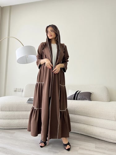 #012قماش تفتة ناعم بني مع اكمام تل مطرز مع طرحة