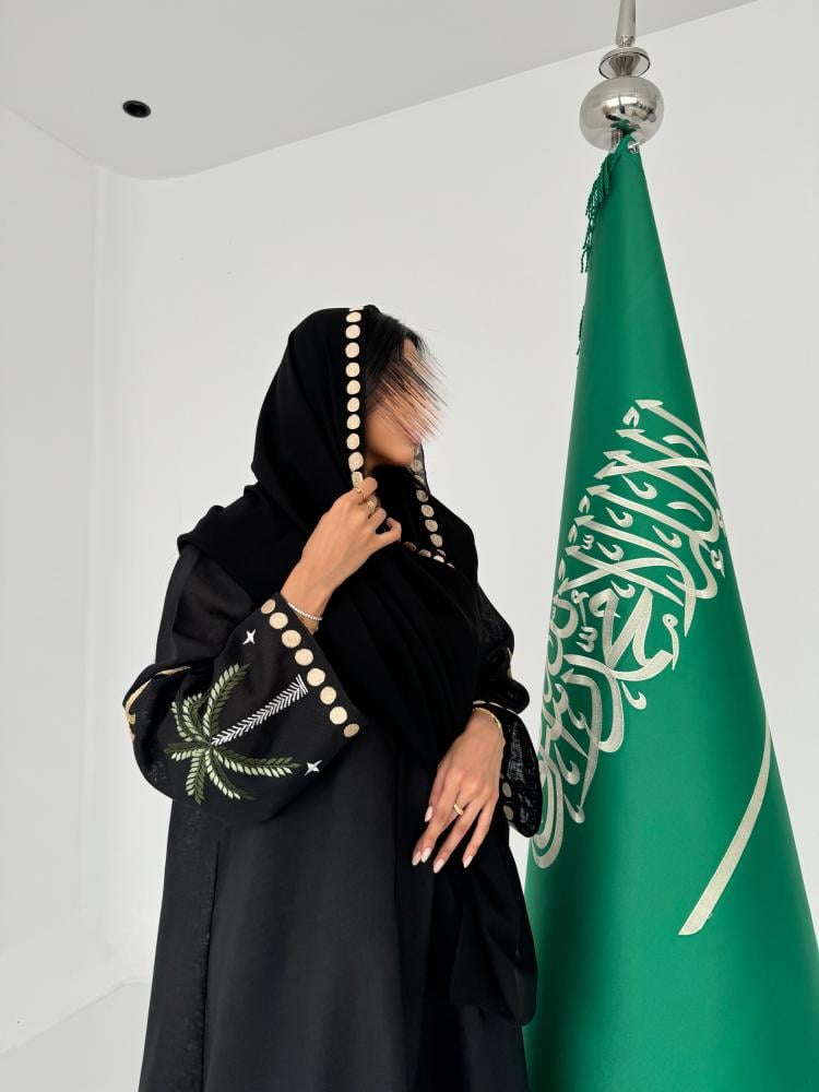 #46 عباية قماش لنن أسود قصة نص كلوش مع تطريز نخلة وسيف وطرحة