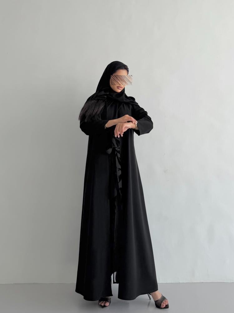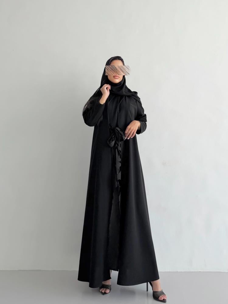 #55 عباية قماش شيفون مبطن اسود دبل فيس كلوش وطرحة شيفون
