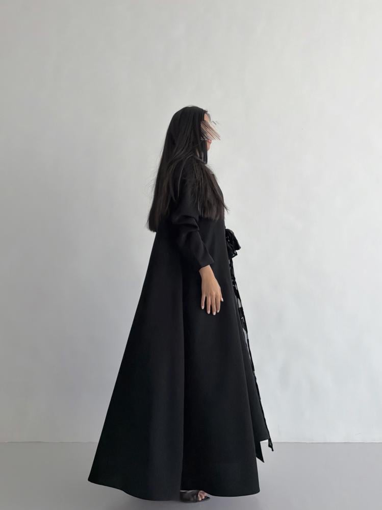 #54 عباية قماش كتان قصة A line مع تطريز وطرحة بطرف قيطان