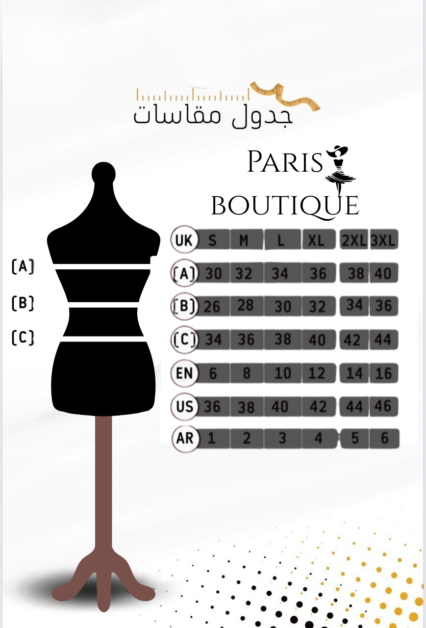 عزيزتي الأنيقة الرجاء التأكد من اختيار المقاس الصحيح . تفاصيل مهمه : المقاسات بالإنش الرقم الكبير بالمتر