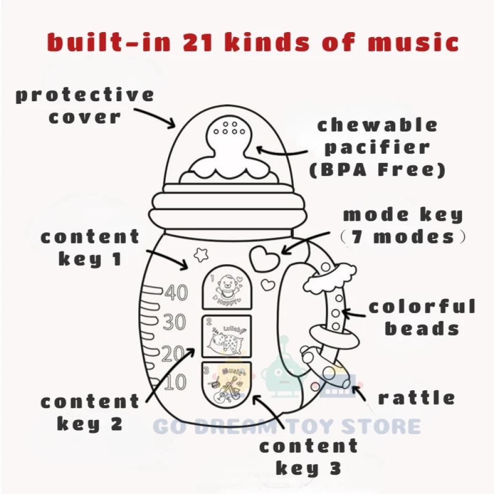 تأتي هذه الزجاجة مزودة بخاصية العضاضة الخشخشة التي تساعد في تحفيز حواس الطفل وتعزز من تنمية مهاراتهم الحركية الدقيقة. بالإضافة إلى ذلك، تحتوي عادة على ميزة الموسيقى التي تعزز من تجربة الطفل وتهدئته خلال فترة التغذية.