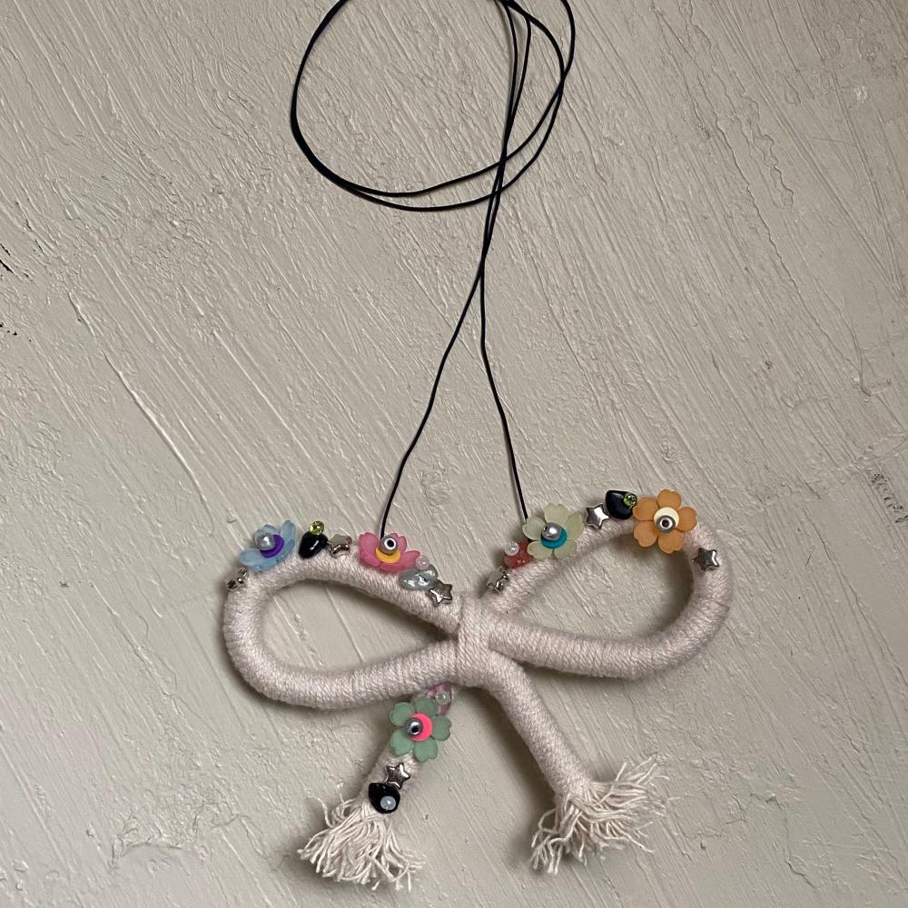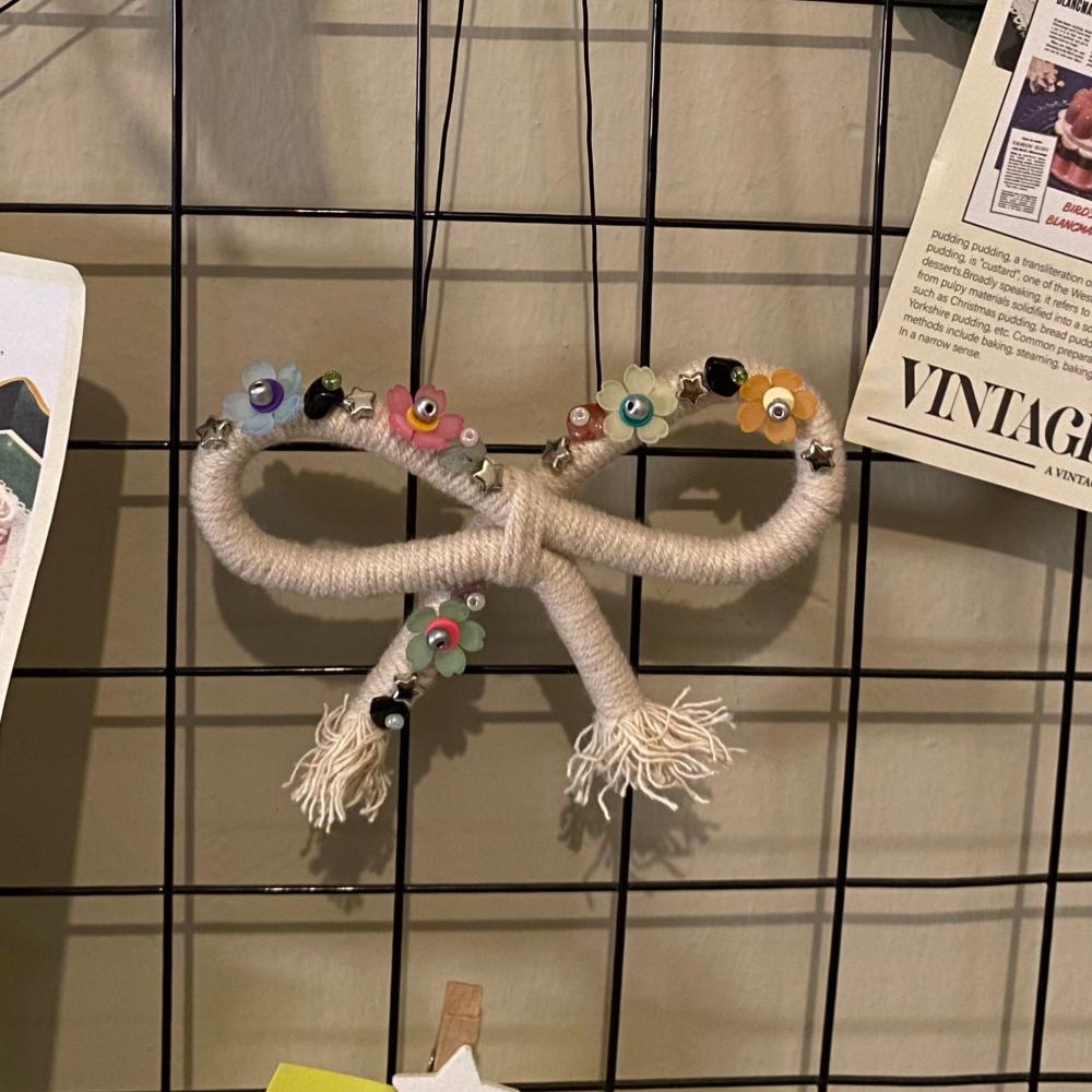 أضف لمسة أنيقة وبوهيمية لسيارتك مع هذه التعلّيقة الفريدة المصنوعة يدويًا من خيوط قطنية طبيعية بلون بيج، مصممة بشكل فيونكة ومزينة بخرزات وأزهار ملونة تمنحها طابعًا مميزًا وجميلاً 🎀