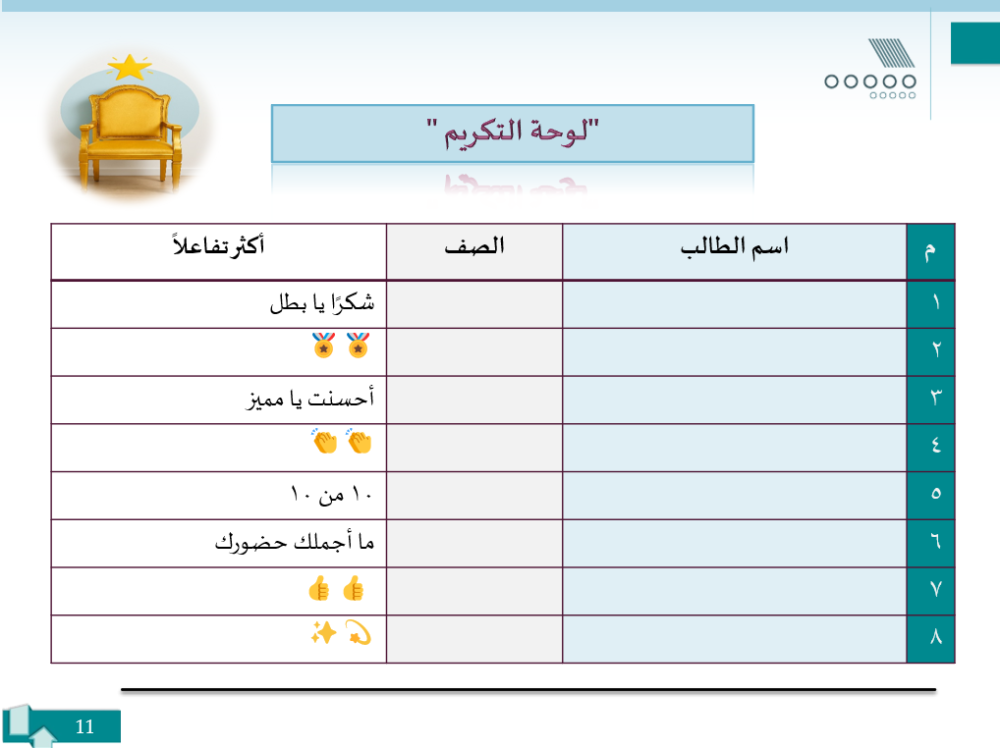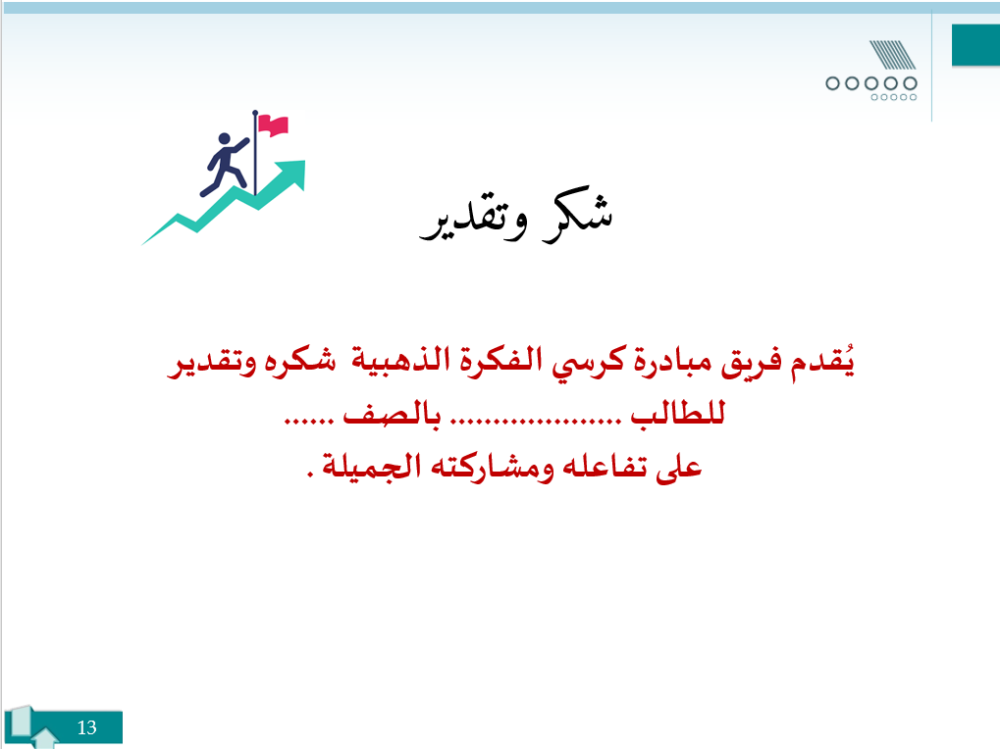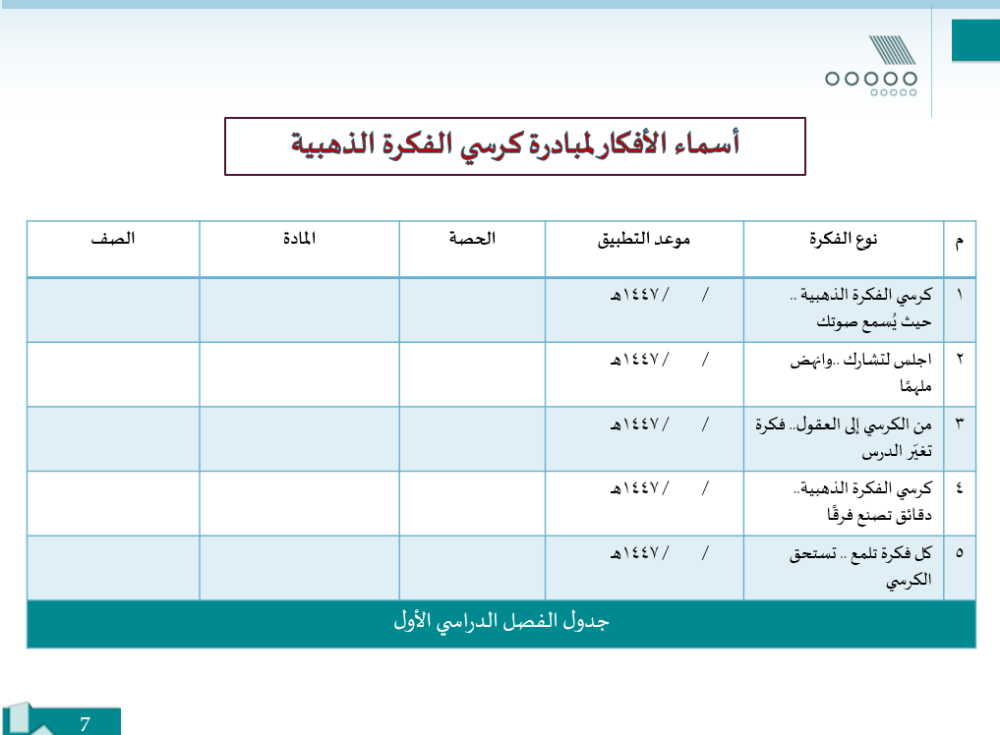 مبادرة تعليمية صفية مبتكرة، تمنح كل طالب فرصة للجلوس على كرسي مميز وتقديم "فكرته الذهبية" أمام زملائه في دقيقتين فقط.