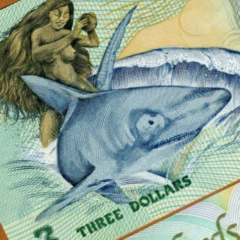 الوجة: عارية إينا تحمل جوز الهند أثناء ركوب القرش المانجو.
