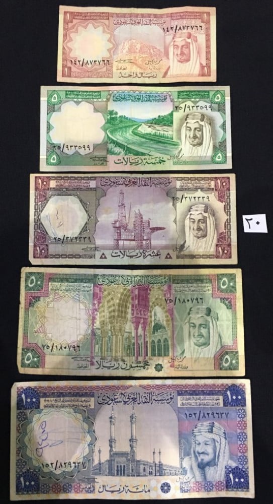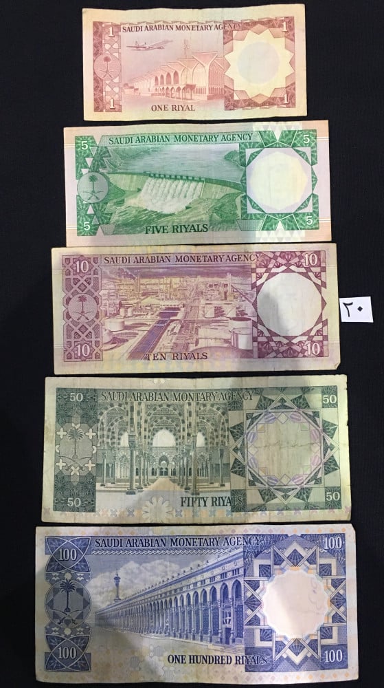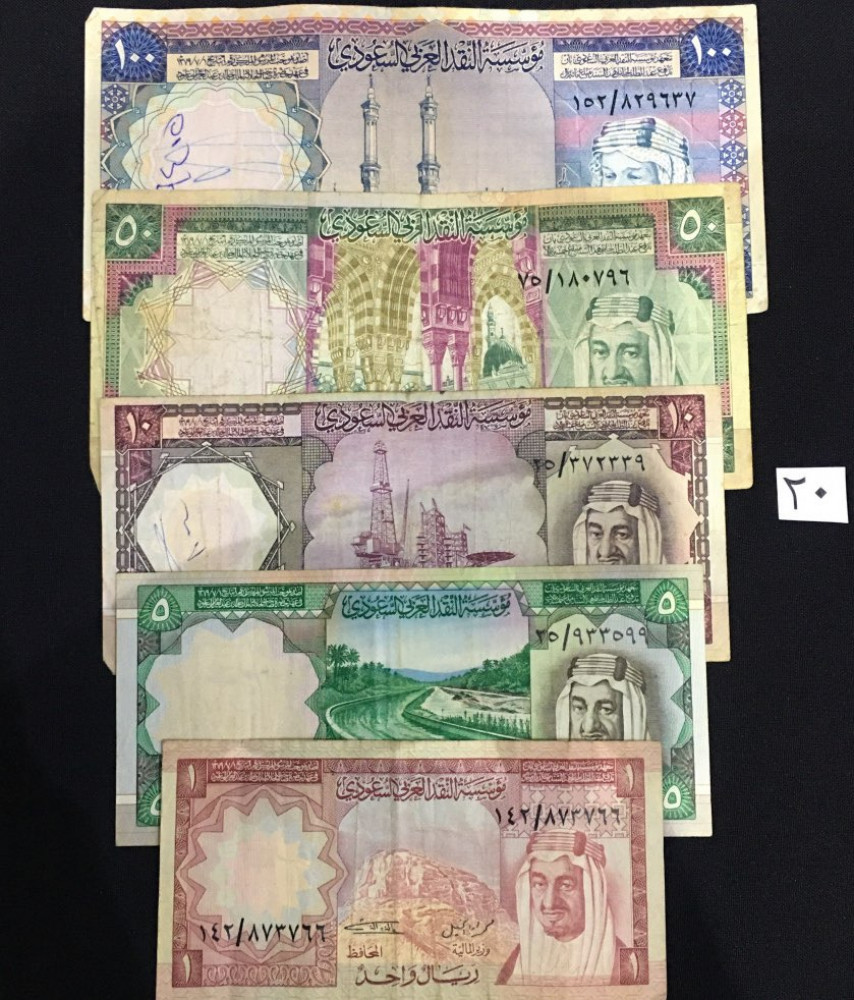 - فئة (5) ريال المعروضة ضمن الطقم تعتبر شحيحه نوعا ما لوجود خطأ بالكتابة (خسه) بدل خمسة، وهناك قول آخر بانها كُتبت بخط الثلث وهو الأرجح لدي.