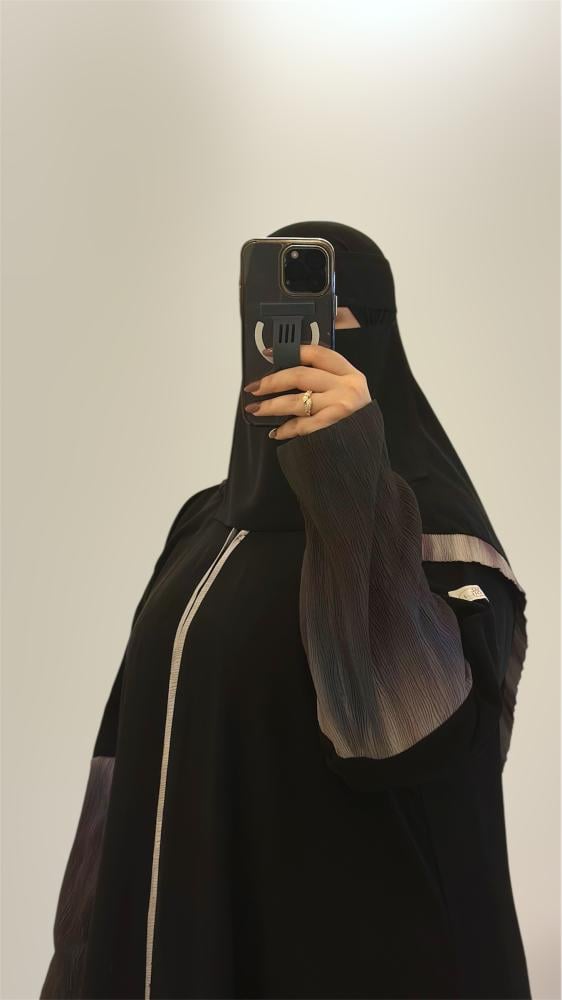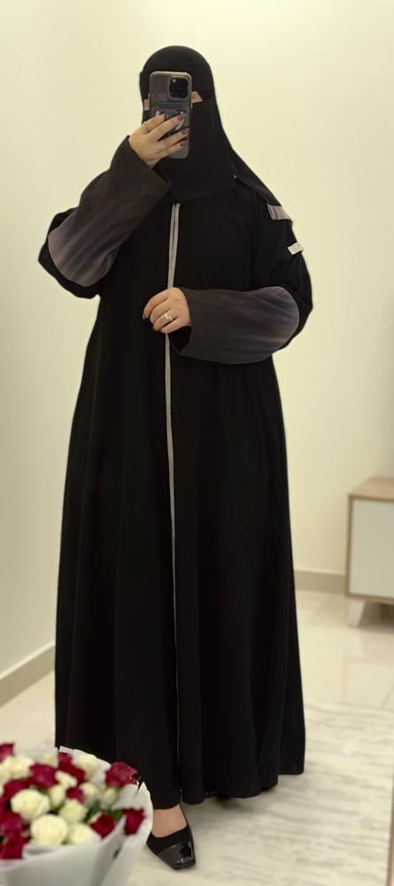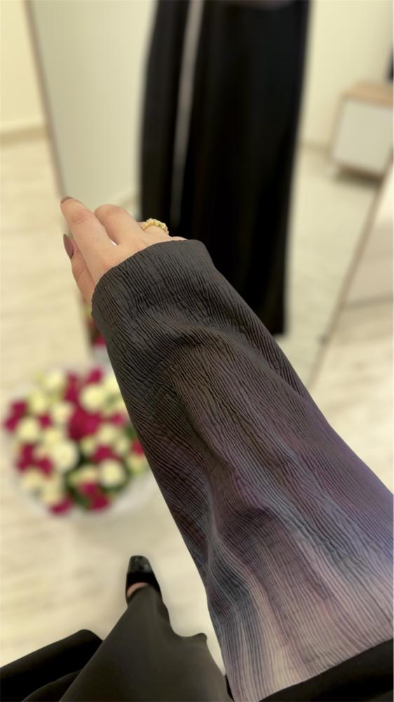 عباية بقماش الكريب الملكي مع أكمام بقماش بليسيه كريب مطعم بتدرجات ألوان مكسر مبطن بكريب ملكي أسود مع طرحة مجاناً منسوج الطرف .