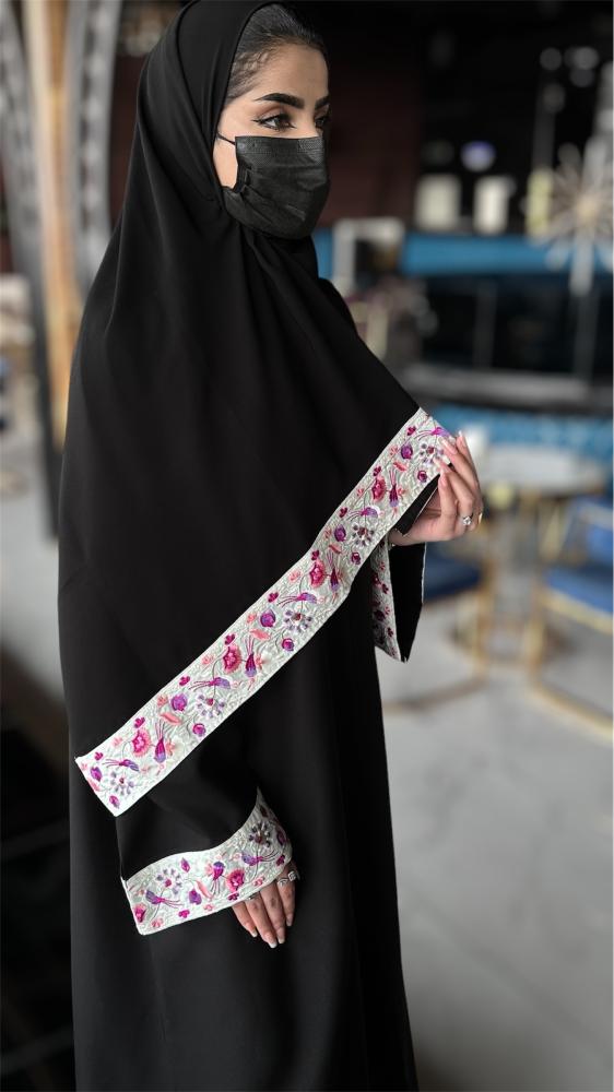 عباية الافندر قماش كريب ملكي مع تطريز ملون بالأكمام مع طرحة مجاناً.