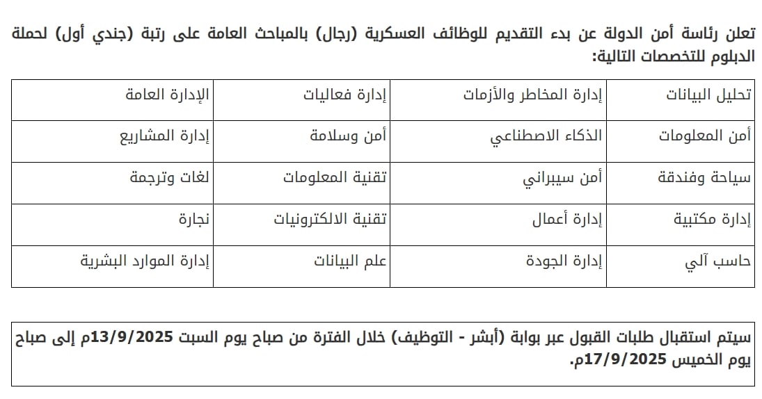 - يشترط حصول المتقدم على (درجة الدبلوم) للتخصصات المُعلن عنها.