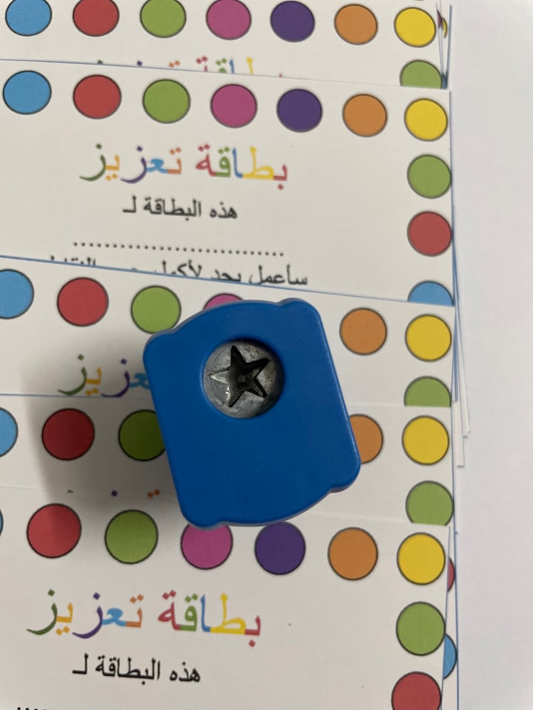 يتكون من 20 كرت مقوى صغير مقاس 11x6.5مع خرامةعند تعزيز الطفل يتم خرم دائرة واحدةويتم مكافئتة عند الانتهاء من جميع الدوائر