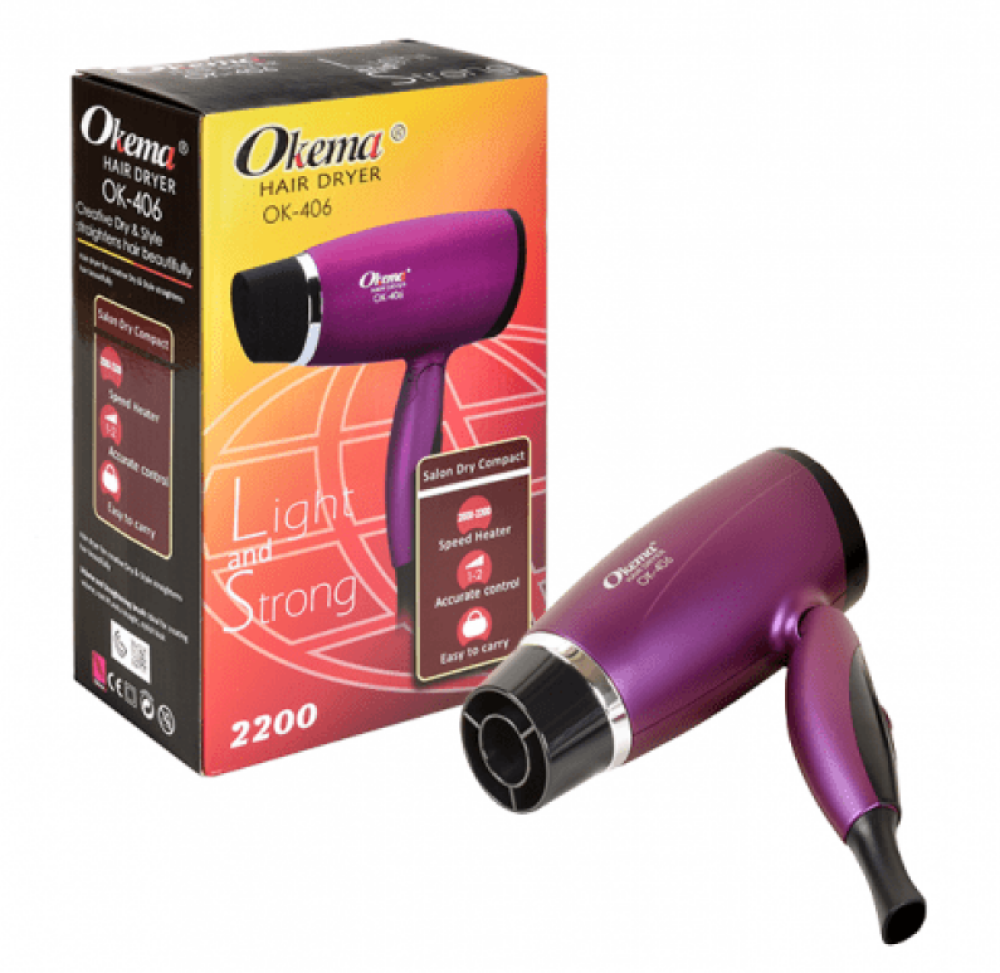 احصلي على نتائج تجفيف احترافية بسرعة مع مجفف الشعر OK-406 من اوكيما الذي يعمل بقوة 2200 واط والمزود بتقية الايونية المضادة للكهرباء الساكنه لشعر شديد اللمعان وخالي من التجعيد بنتائج احترافية
