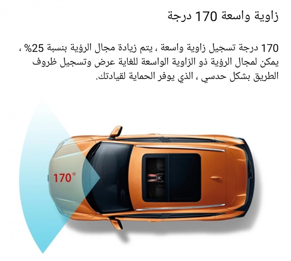 170 درجة تسجيل زاوية واسعة ، يتم زيادة مجال الرؤية بنسبة 25% ، يمكن لمجال الرؤية ذو الزاوية الواسعة للغاية عرض وتسجيل ظروف الطريق بشكل حدسي ، الذي يوفر الحماية لقيادتك.