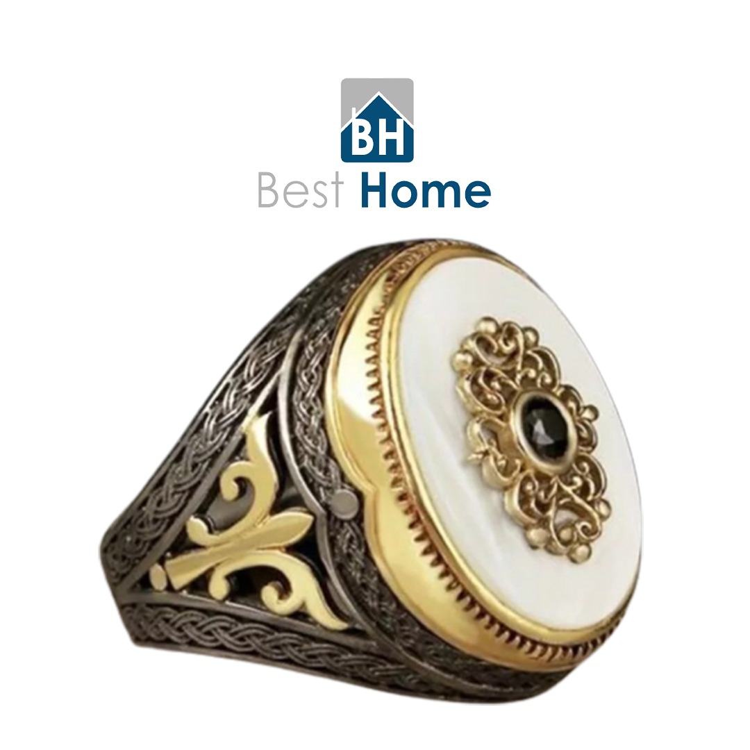 خاتم رخام ابيض مطرز فضي بفص اسود