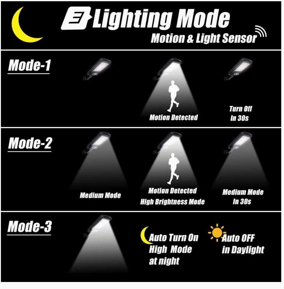 - 【3 أوضاع إضاءة + جهاز تحكم عن بعد】يحتوي مصباح الليد الشمسي الخارجي هذا على 3 أوضاع إضاءة: الوضع 1: مستشعر حركة ضوء كامل السطوع. الوضع 2: سطوع متوسط + مستشعر حركة ضوء كامل السطوع. الوضع 3: يضيء بشكل مستمر في الظلام. من السهل اختيار الوضع من خلال الزر أو جهاز التحكم عن بعد لتلبية متطلباتك المختلفة، مما يتيح لك الاستمتاع بأسلوب حياة أكثر ملاءمة وصديق للبيئة.