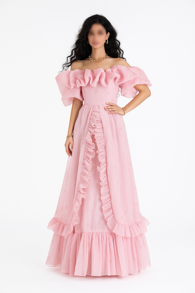 الفستان هذا قطعة فنية بحد ذاته 🤍✨.. جاي بلون وردي هادي وناعم يلفت النظر من أول لحظة، ويعكس أنوثة ورِقّة ما تتكرر. تصميمه واسع ومريح، وفي نفس الوقت أنيق وفخم. اللمسة الأجمل فيه الرuffles اللي موزعة بشكل مرتب من أعلى الكتف لين آخر الفستان، تعطيه حركة ونعومة مع كل خطوة.