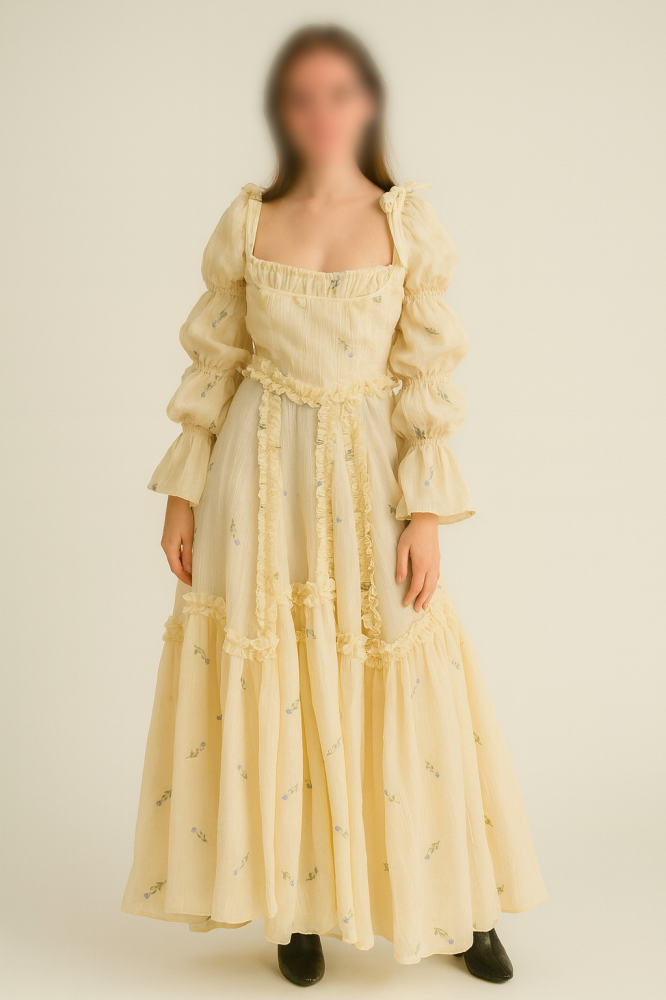ارتقي بإطلالتك إلى مستوى من الرقيّ الخيالي مع هذا الفستان الساحر المصمم بدقة وفنّ. يتميز هذا الفستان بتصميم أنثوي ناعم، مستوحى من الأناقة الكلاسيكية بلمسة عصرية حالمة