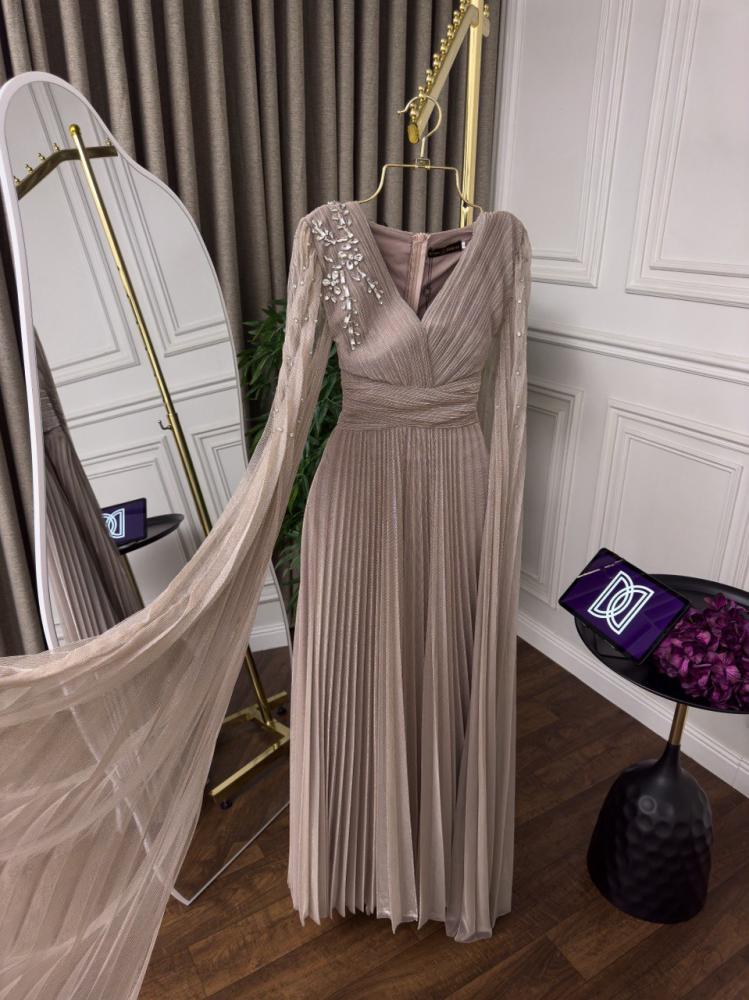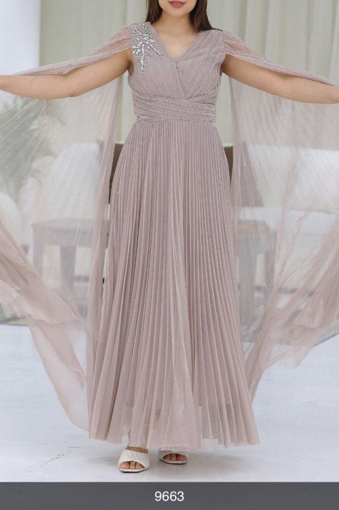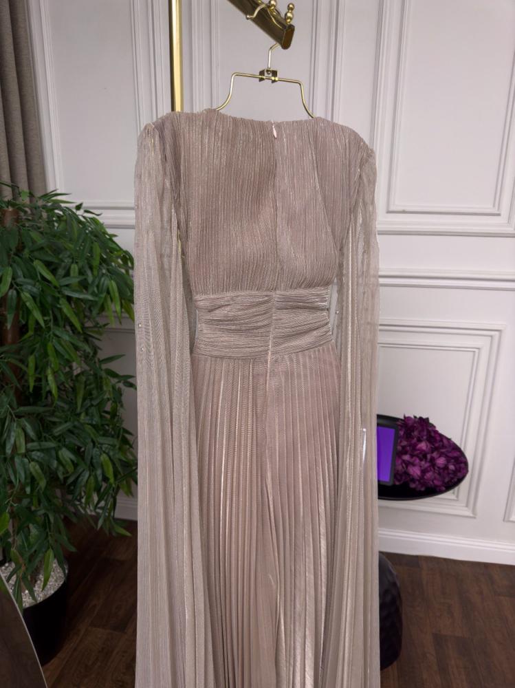 - التصميم: ياقة V مع أكمام كيب وتطريز فضي.