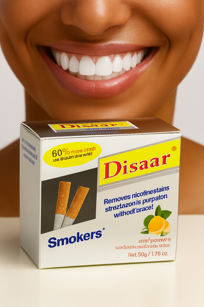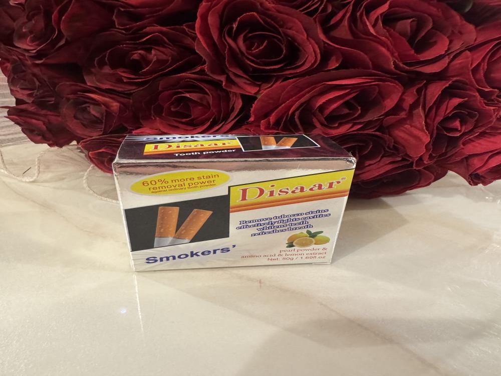 بودرة أسنان "Disaar Smokers Tooth Powder". تم تصميم هذا المنتج خصيصًا للمدخنين لإزالة بقع التبغ وتبييض الأسنان.