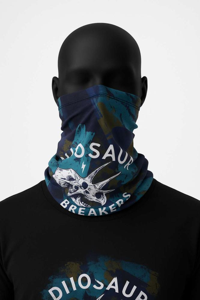أطلق روح المغامرة مع قناع مستوحى من عصور الديناصورات، بتصميم فني يجمع رسمة جمجمة الترايسيراتوبس وألوان طبيعية متداخلة. مصنوع من بوليستر مرن وخفيف