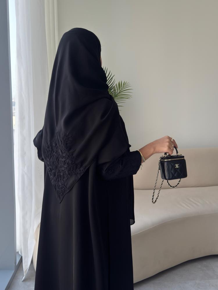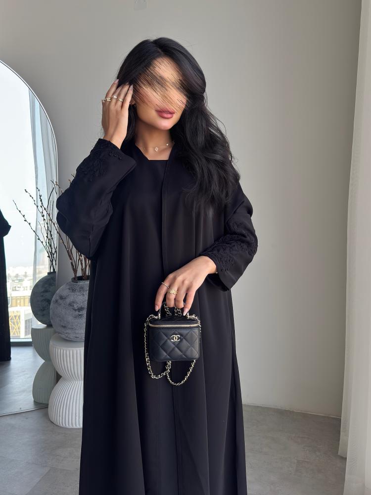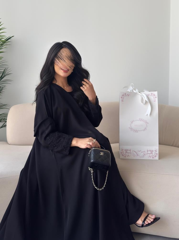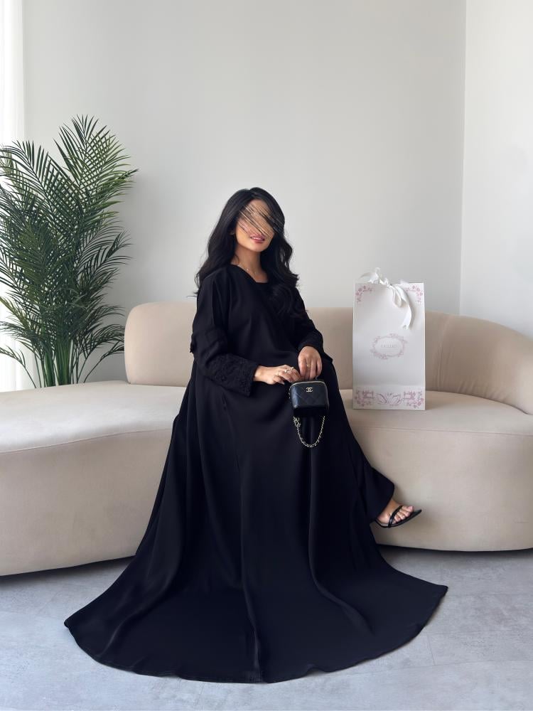 عباية بتصميم أنيق وسادة يمكن تنفيذها حسب اختيارك من الأقمشة والخامات المتوفرة، مع إمكانية إضافة تطريز يدوي بالأسود برسوم إضافية.