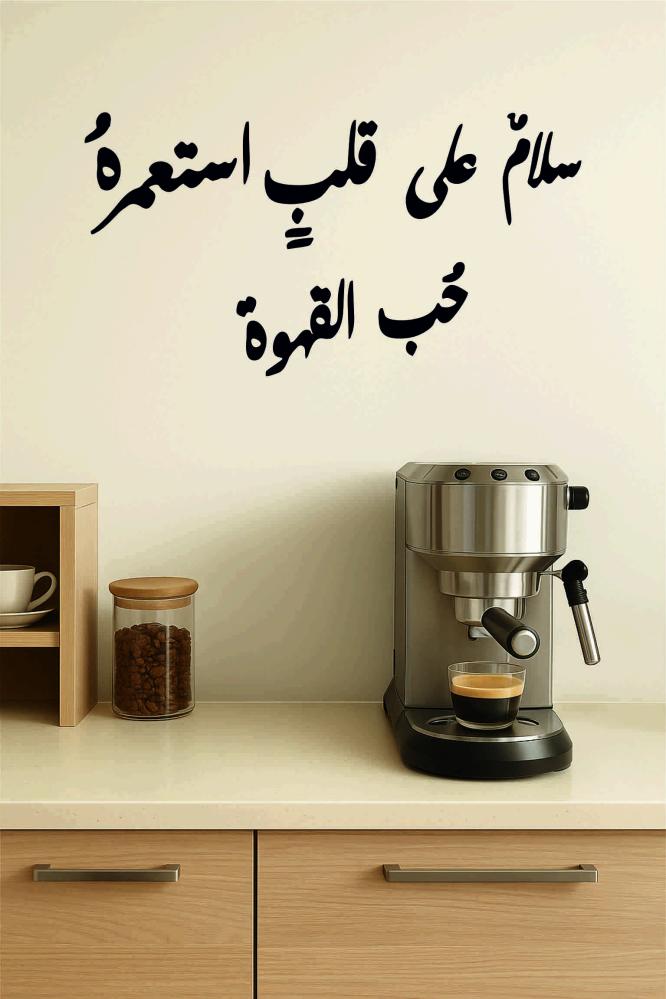 عبارة عربية بخط أنيق تُعبّر عن شغف القهوة، مثبّتة على جدار بلون اسود يبرز جمال التصميم.