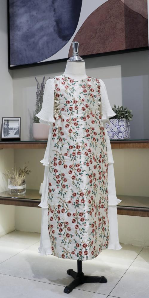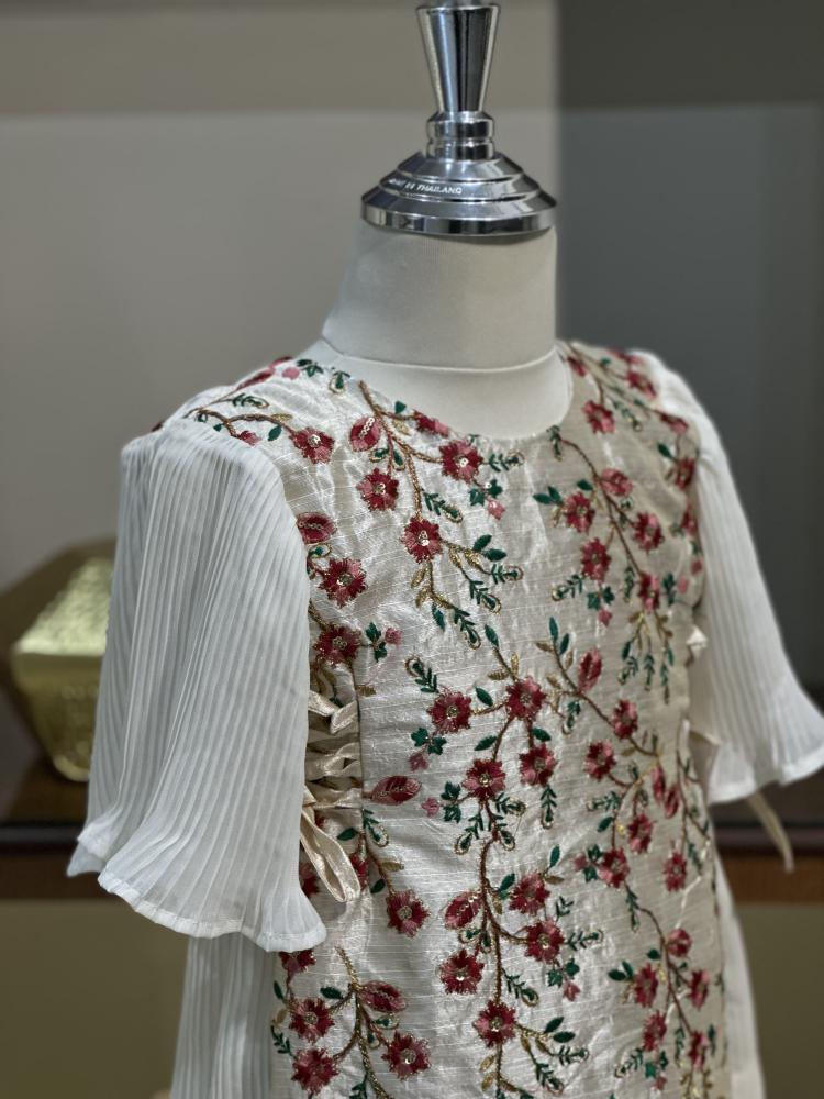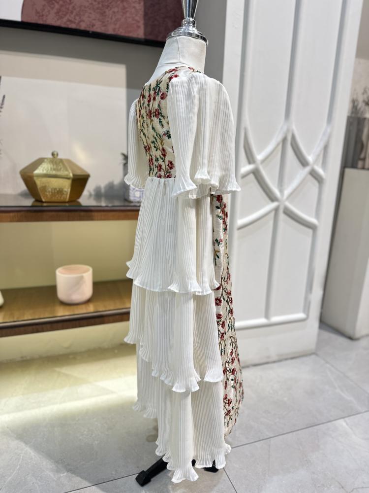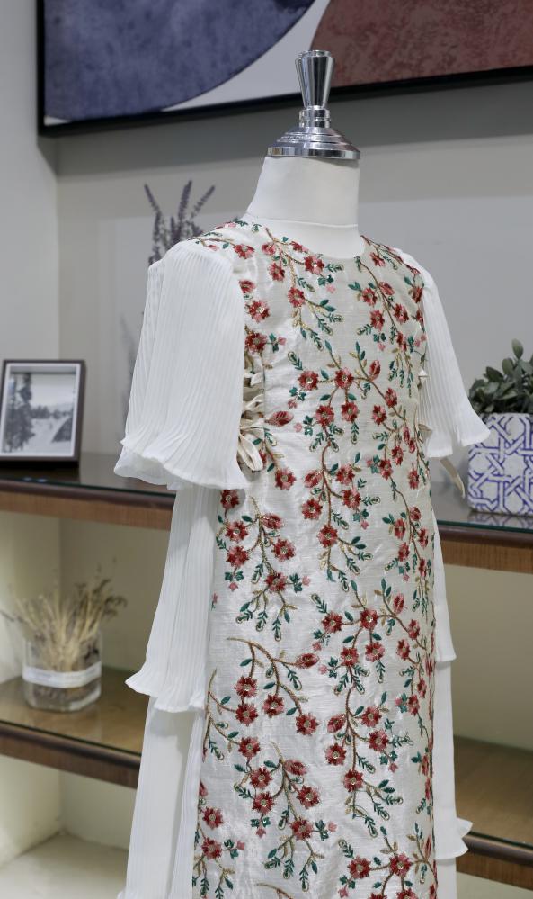 جلابية طقم لك ولطفلتك مطرزة بالنقش الهندي البارز من الأمام ومحاكة من الخلف بطبقات قماش الشيفون المكسر مع ربطات جانبيه للتحكم بمقاس محيط الصدر