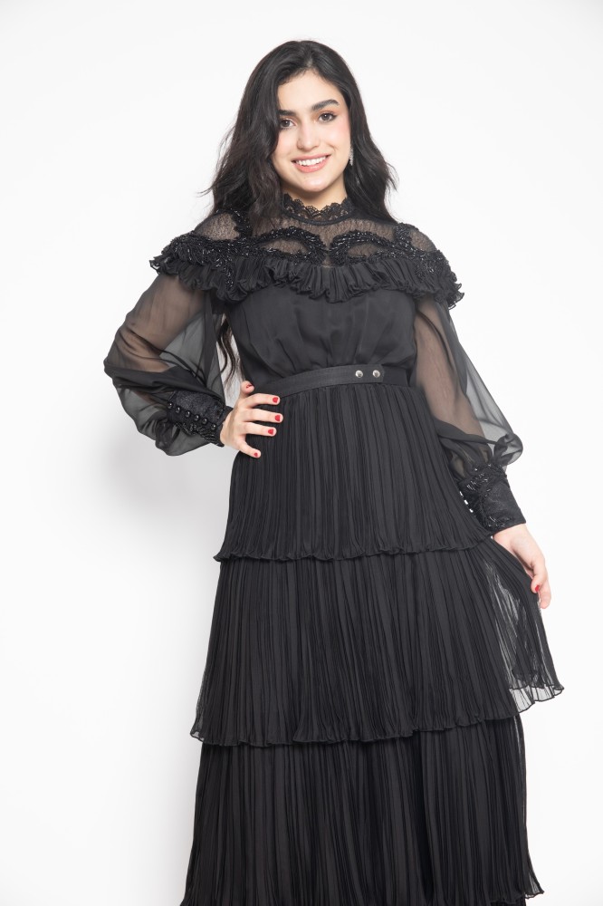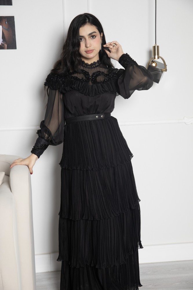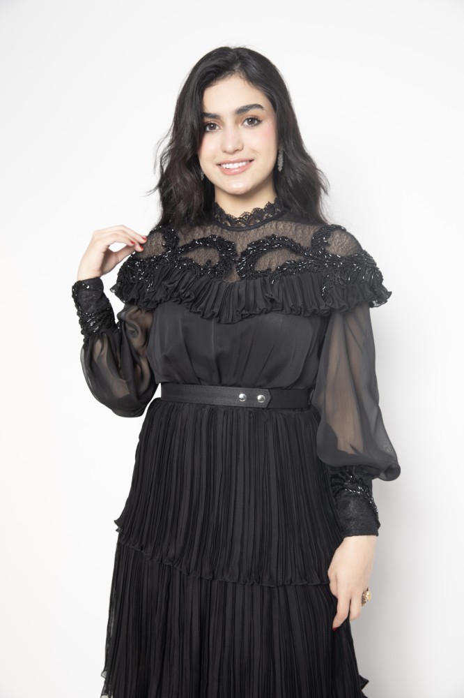 تألقي بإطلالة ملفتة للإنظار مع فستان اسود ناعم , يتميز بتصميم مفعم بالأنوثة بأكمام , يجعله خياراً رائعاً لأي مناسبة ترغبين التألق بها