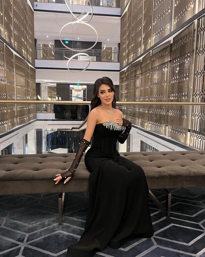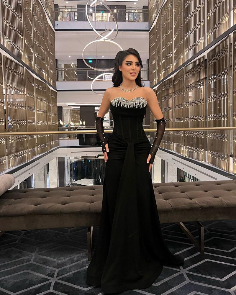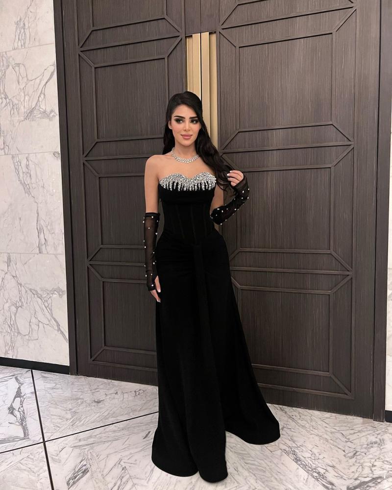 فستان مخمل مطرز باللون الأسود مصمم بأناقة، يعكس أناقة وفخامة المرأة التي ترتديه. تم تصميم هذا الفستان من قماش مخمل مطرز بأرقى التفاصيل، مما يجعله قطعة فريدة ومميزة في خزانة ملابسك.