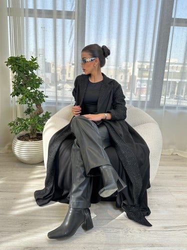 عبايه رسميه مخمل نص كلوش بتطريز خاص بلون فضي على شكل قلتر مبطنة بقماش بونجيه مع طرحه اسود.
