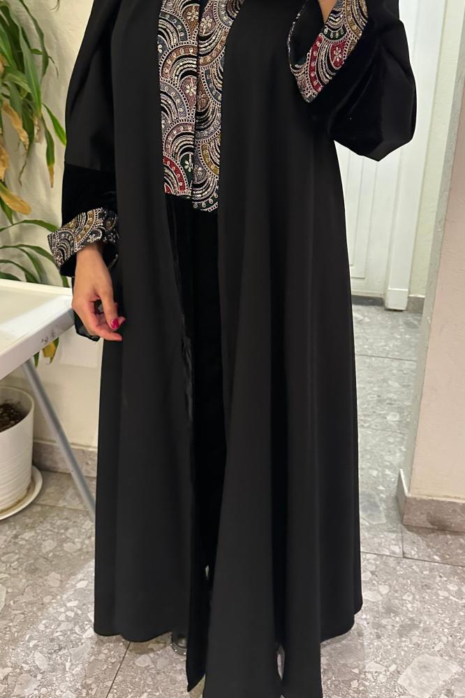 عباية كتان اسود كلوش من قماش الكتان تتميز بتفاصيل أنيقة مع أطراف أكمام مخمل ومطرزات هندية رائعة على الأكمام والأمام لتجمع بين الراحة والفخامة في تصميم واحد لا تفوتي الفرصة واحصلي عليها الان من byadir-abaya