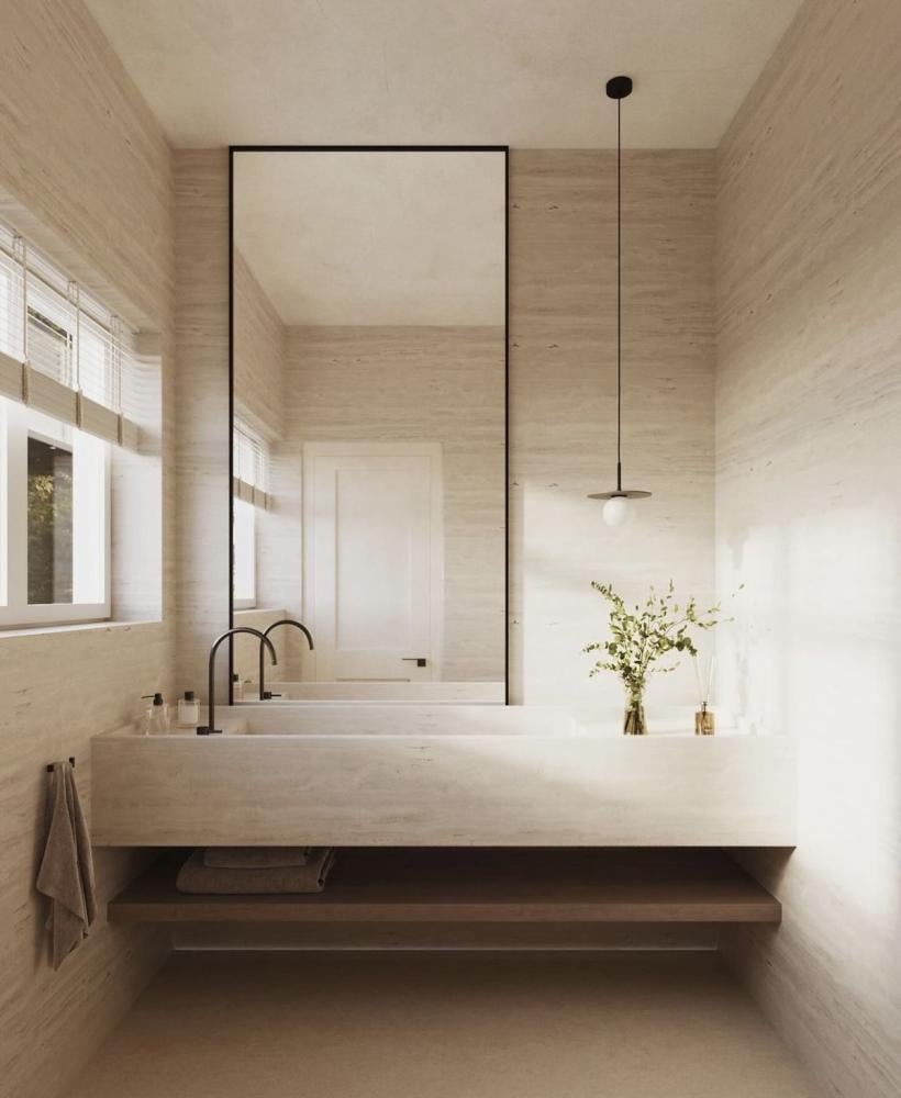 • السطح: مصنوع من الرخام الترافنتينو الفاتح بألوان بيج طبيعية وتفاصيل أنيقة تضفي مظهرًا بسيطًا وفخمًا.