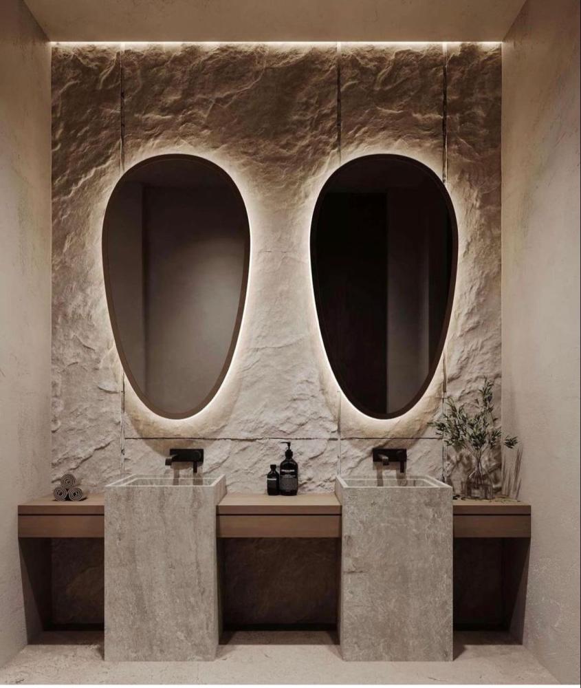 • المرايا: مرايا عمودية ذات تصميم بيضاوي مبتكر مدمجة في جدار خشن بتشطيبات طبيعية، مع إضاءة خلفية تضفي أجواء دافئة ومميزة.
