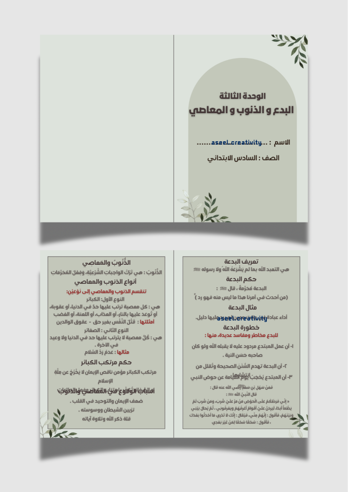 مطوية ( البدع و الذنوب و المعاصي ) لمادة الدراسات الاسلامية للصف السادس الابتدائي