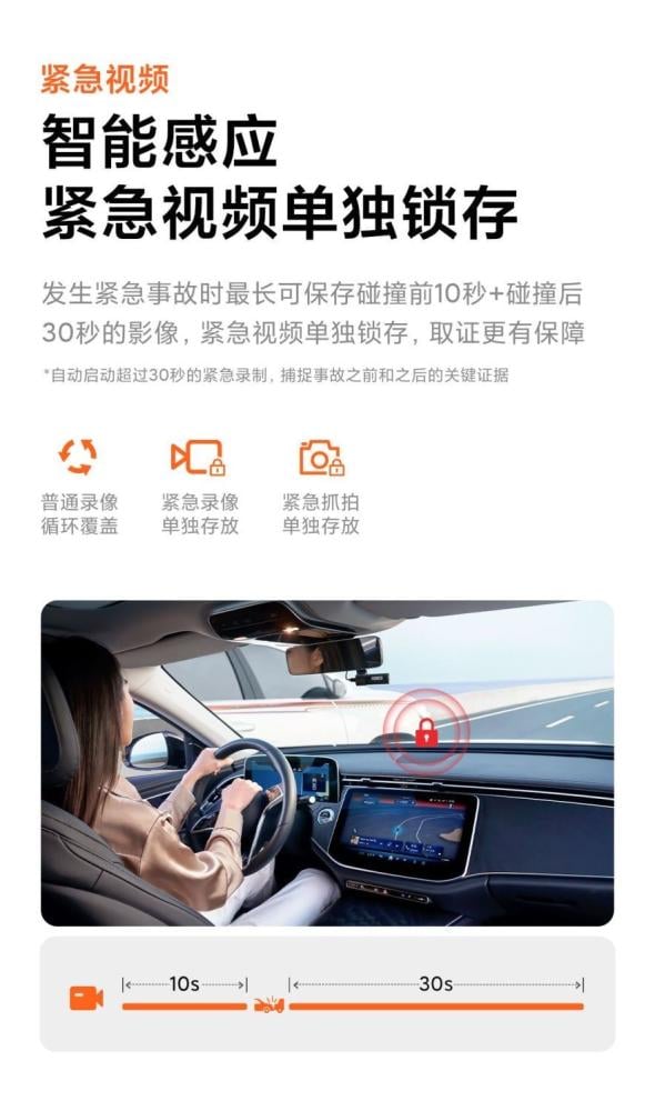 عند استشعار أي اصطدام أو اهتزاز (عبر مستشعر G-Sensor)، تقوم الكاميرا بتسجيل فيديو طارئ خاص وتخزينه في ملف منفصل ومقفل. تلتقط اللقطة الحرجة 10 ثوانٍ قبل الاصطدام و30 ثانية بعده، لضمان أدلة كاملة ومحمية.