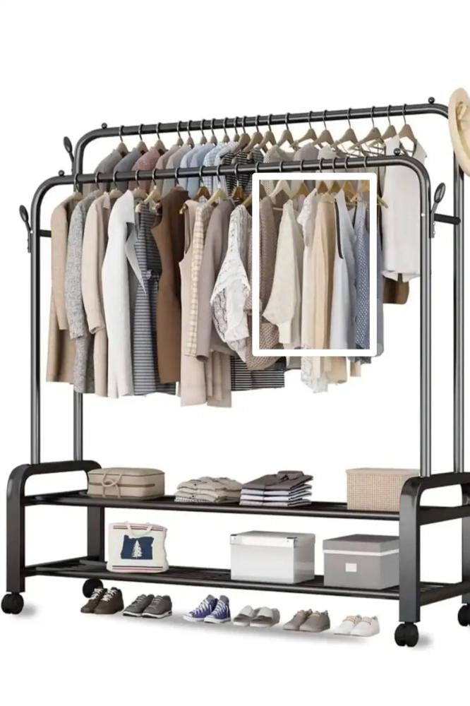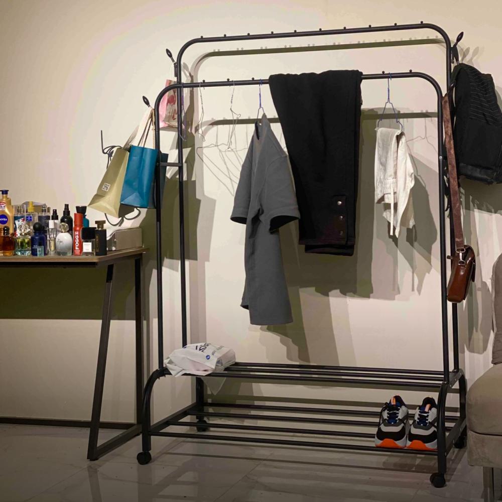 متجر الرضا يرضيك يوفر لكم علاقة ملابس معدنية بعجلات مقاس 150×57×110 سم، أسود