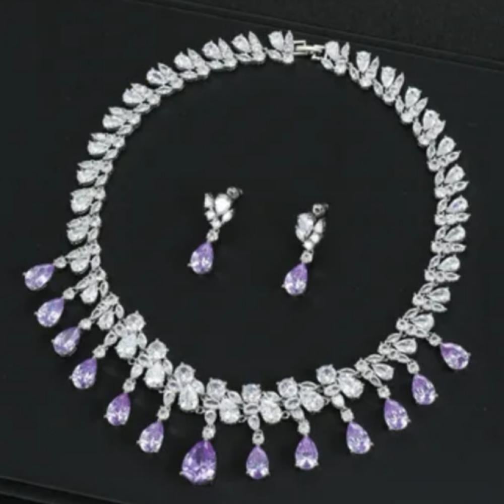 عقد واقراط من أحجار الزركون الحقيقي اللامعالمعدن النحاس مطلي بالذهبالمقاس طول القلادة مايقارب 45سمطول الأقراط 4سم
