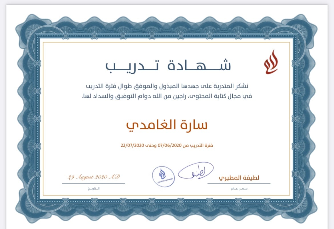 - كاتبة محتوى حاصلة على شهادة تدريب من مؤسسة لام لصناعة المحتوى