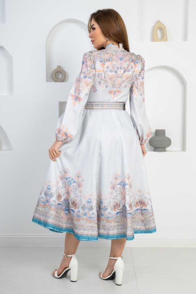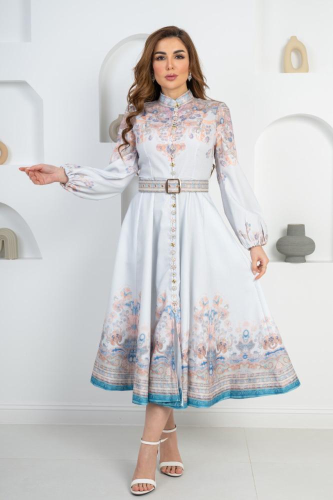 - أبيض مزين بنقوش بألوان الباستيل: لإطلالة هادئة وفاخرة.