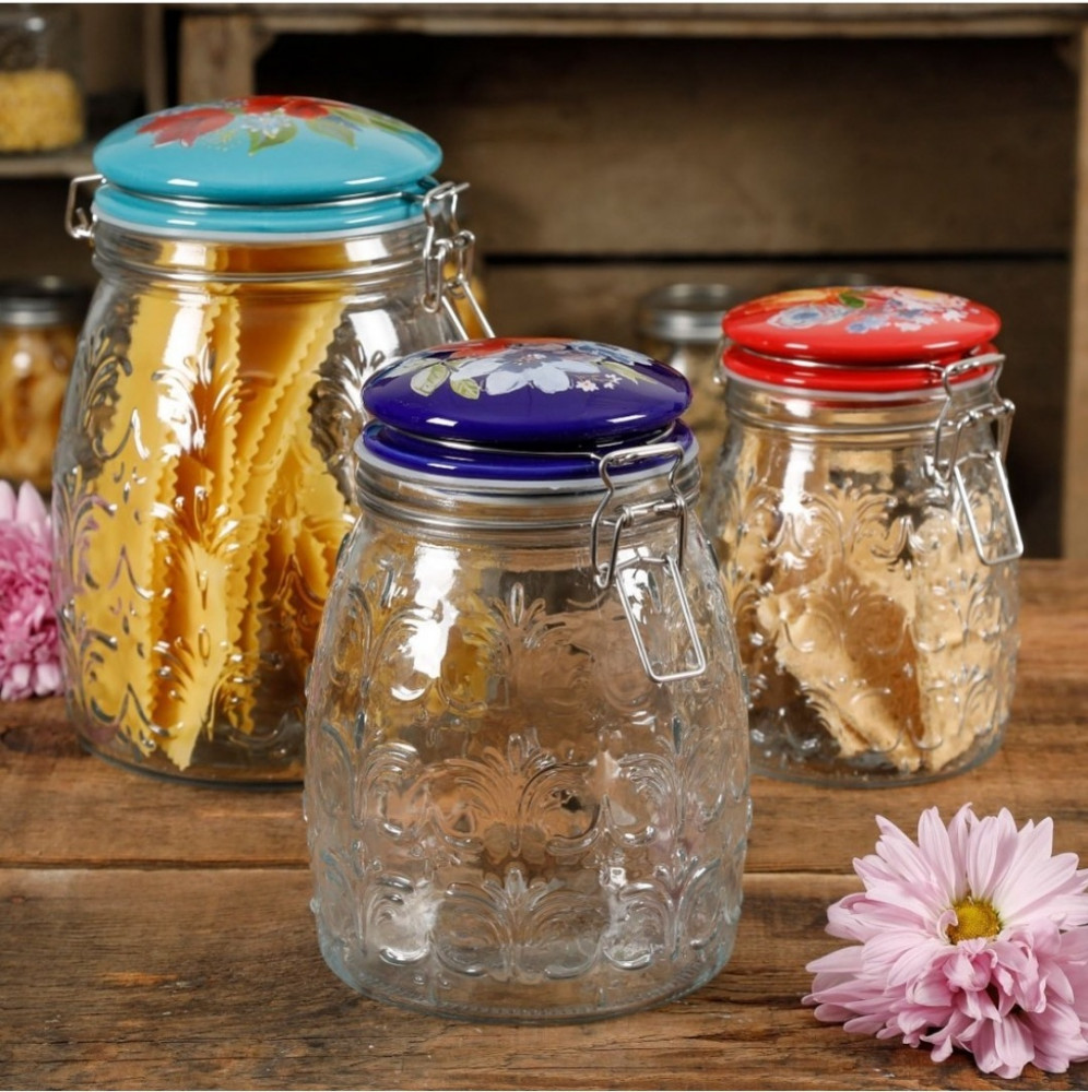 طقم جار زجاج سميك مع نقشهمناسب لحفظ الكوكيز و الرز والطحين محكم الاغلاق أغطيه ملونه بايونير ومن3 أحجام كبيرهوسط /صغيره