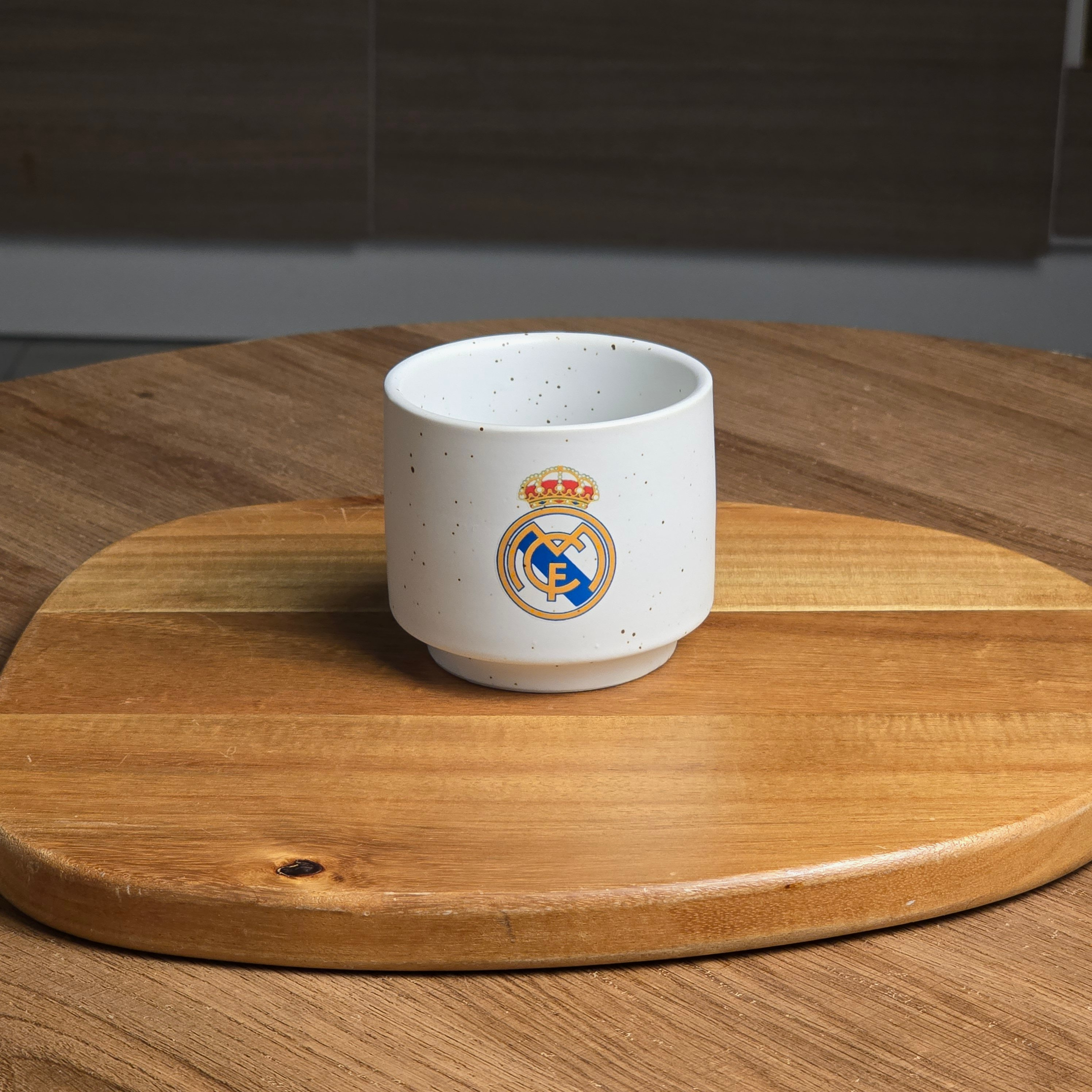 - كوب أبيض منقط أنيق، يميزه شعار ريال مدريد لماع