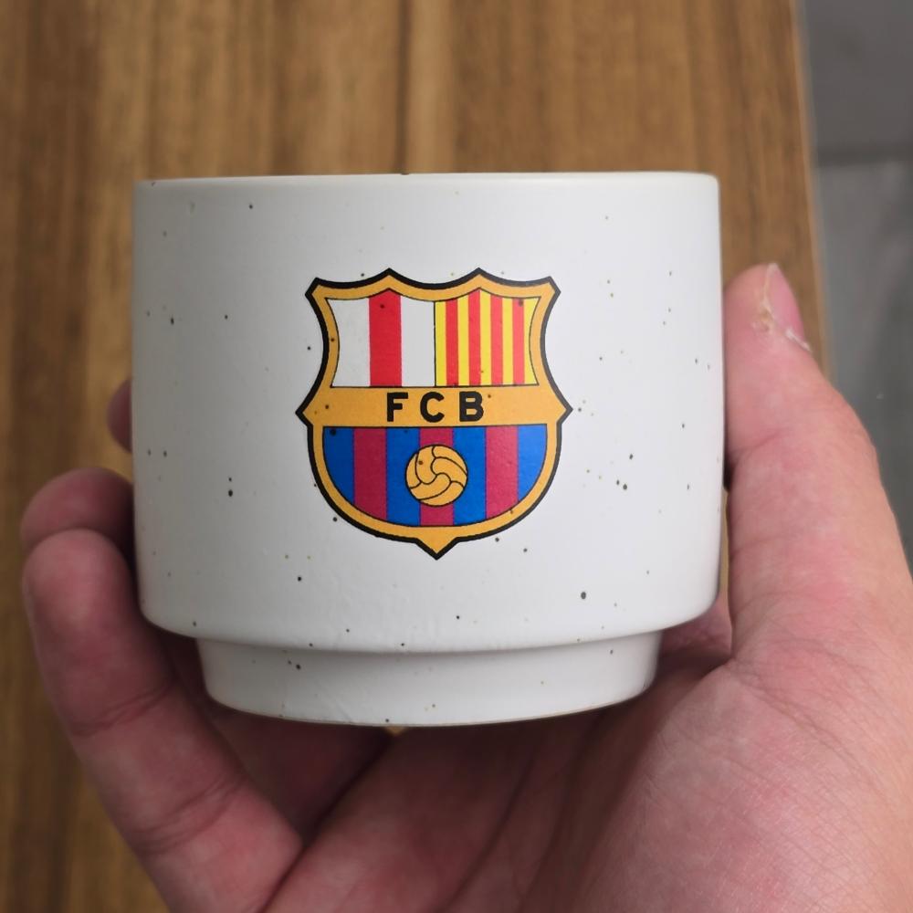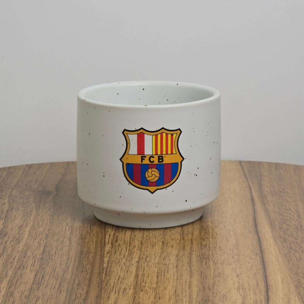 - كوب أبيض منقط أنيق، يميزه شعار برشلونه بشكل لماع